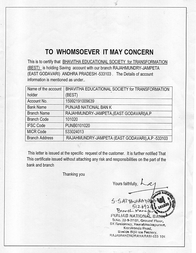 Name of the account holder: BHAVITHA EDUCATIONAL SOCIETY for TRANSFORMATION (BEST)